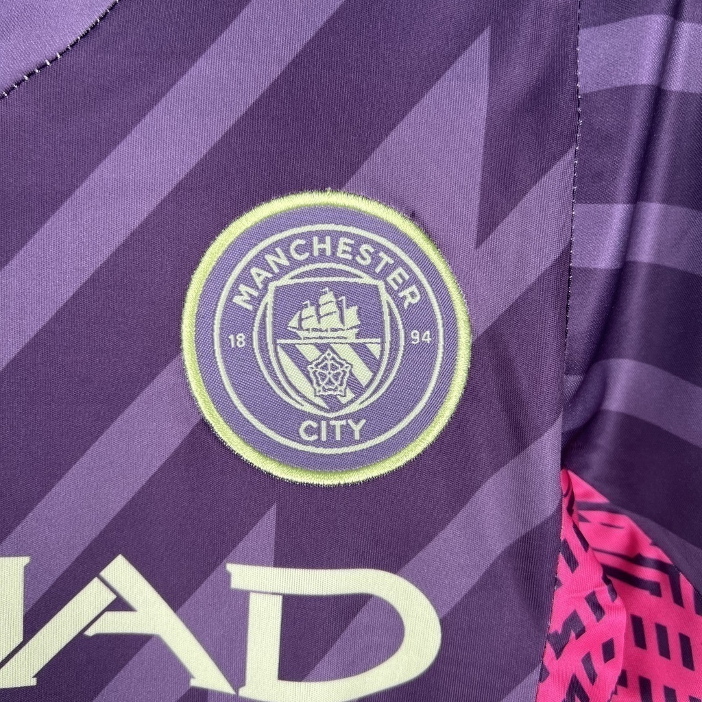 Kit Infantil Manchester City Goleiro Puma 23/24 - Roxo com detalhes em rosa e dourado